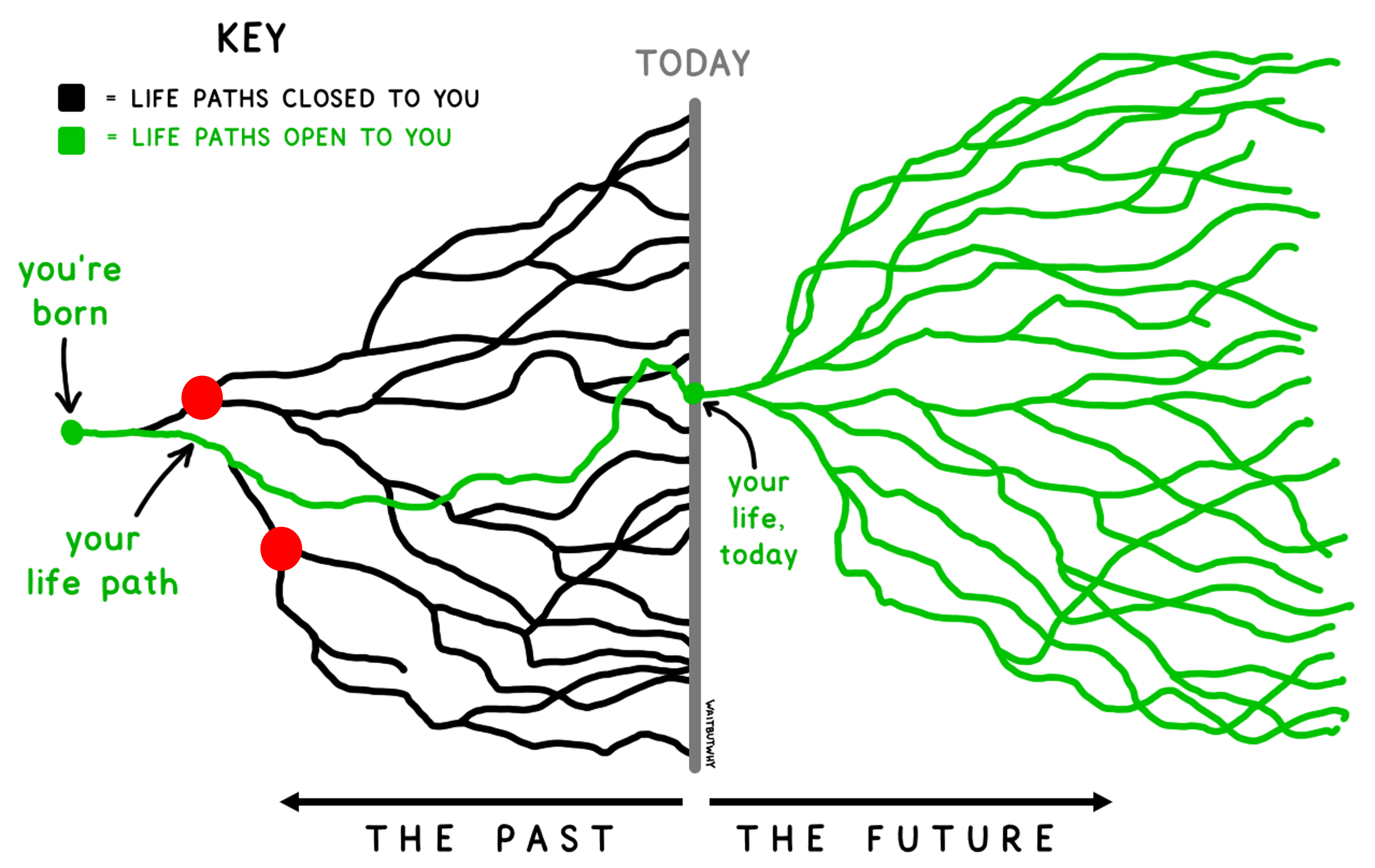 Below is a graphic from the writer Tim Urban (known for the blog Wait But Why). It shows branches depicting the life paths open and closed to us. I think it’s a powerful and provocative visual - it suggests the future is full of possibility. As Urban wrote last year in a New York Times guest essay: “We think a lot about those black lines: the roads not taken, the opportunities missed, the ones that got away. But most of us greatly underestimate the size of the lush green tree of possibilities that lie ahead of us.”